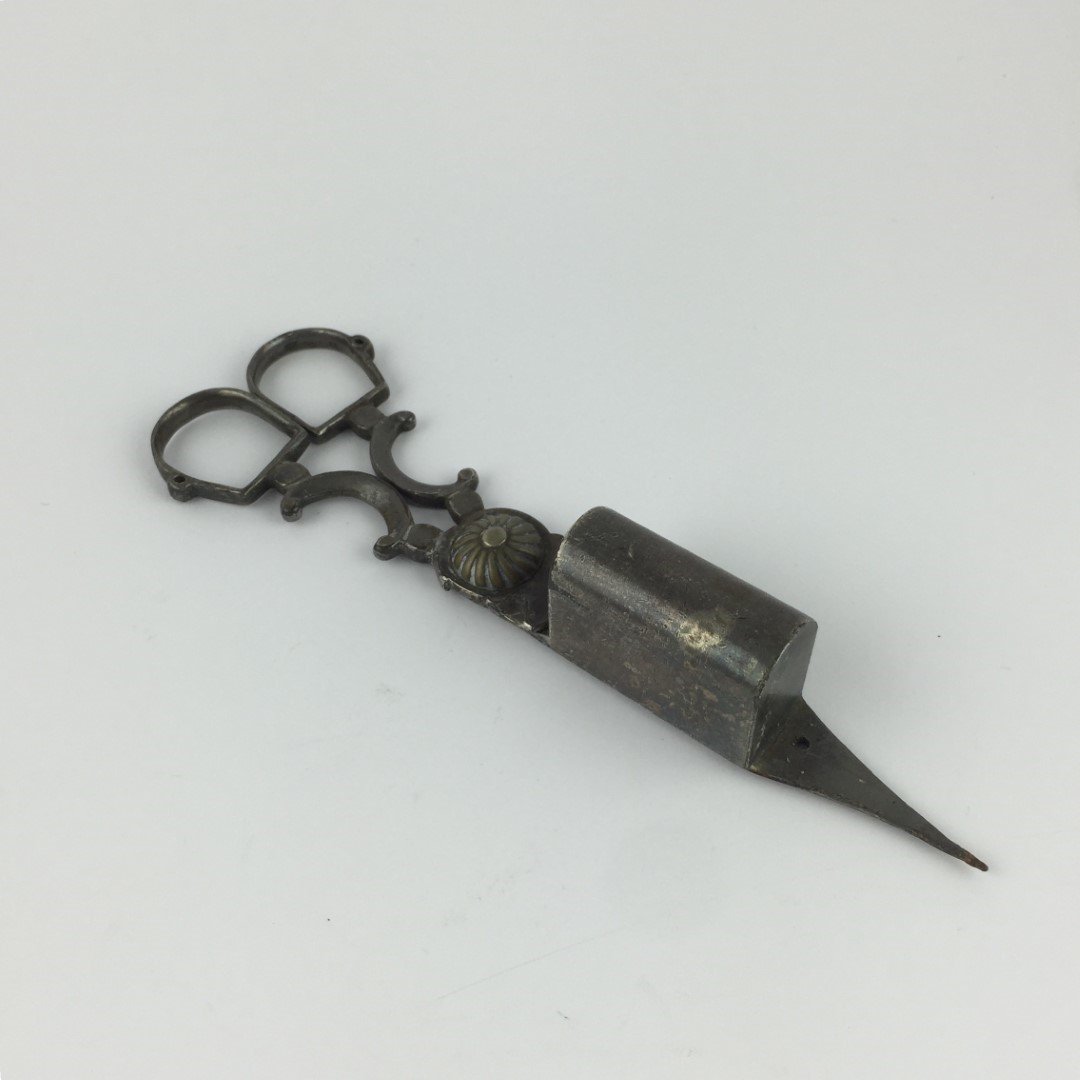Antigua tijera despabiladora en metal plateado. Largo 17 cm.
