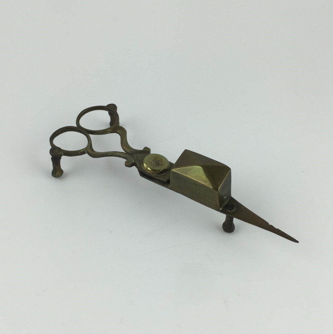 Antigua tijera despabiladora en bronce, con tres patitas. Largo 14 cm.