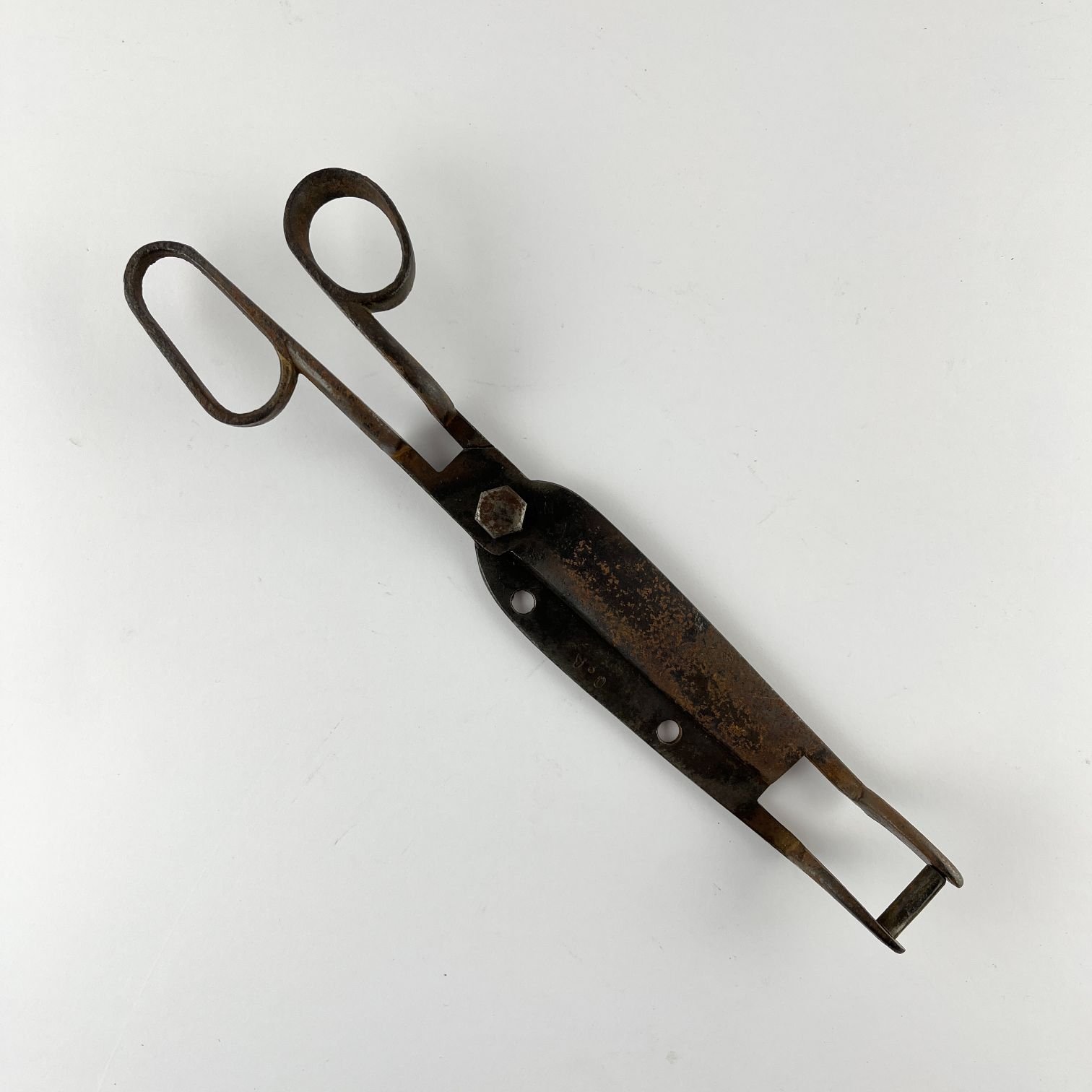 Antigua tijera en hierro forjado marcada con iniciales “O.A.”. Largo 27 cm.