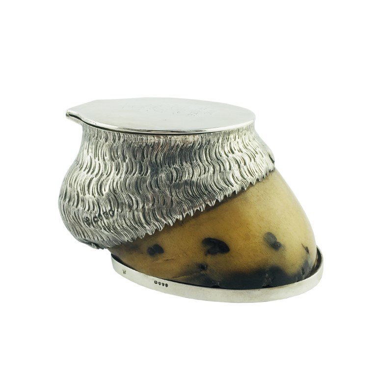 Tintero ingles en vaso de caballo con base y montura en plata de Londres año 1878. Tapa abatible grabada “blasón”, fechada “Feb 22 1879”. Interior con depósito en cristal facetado con virola en plata. 8 x 14 x 11 cm.