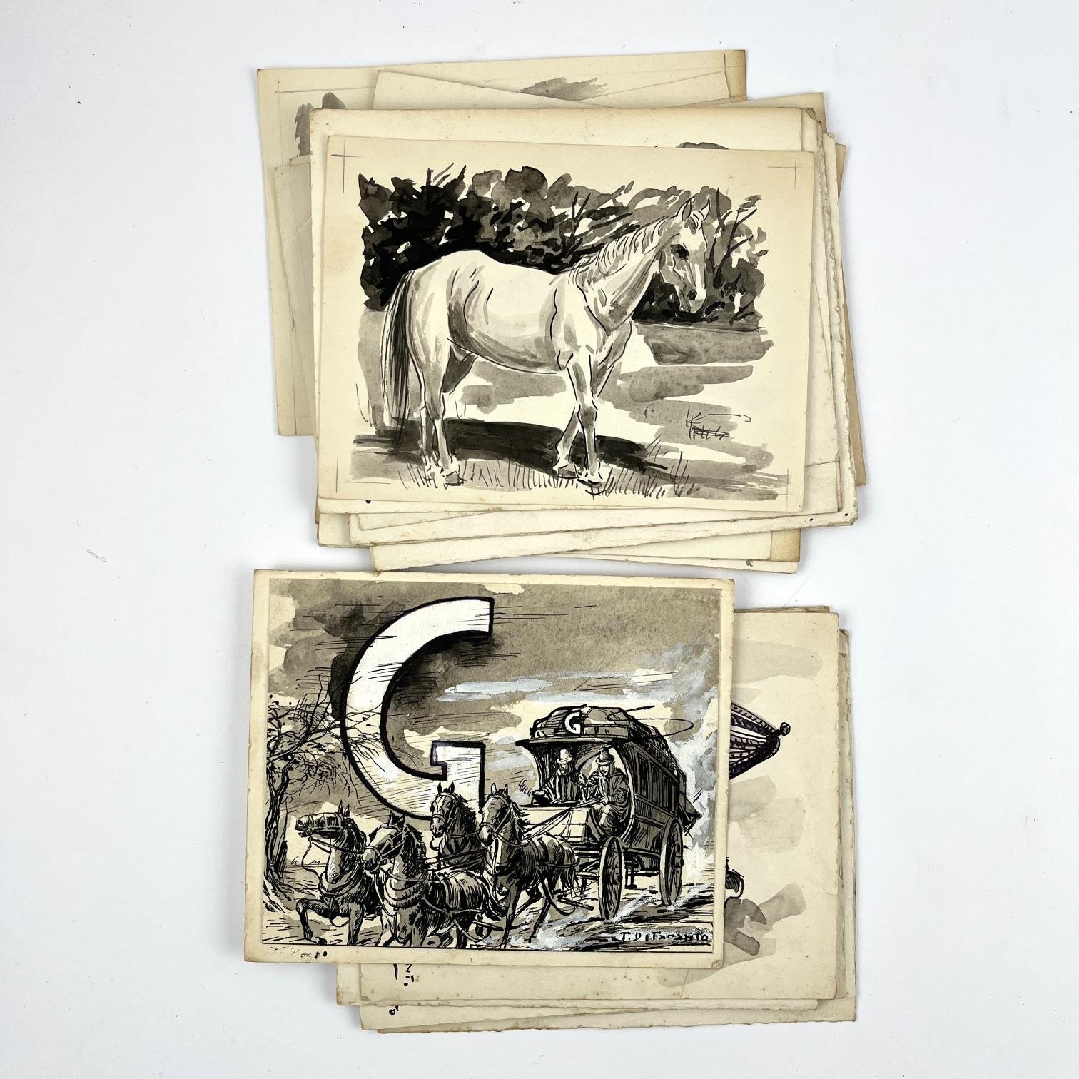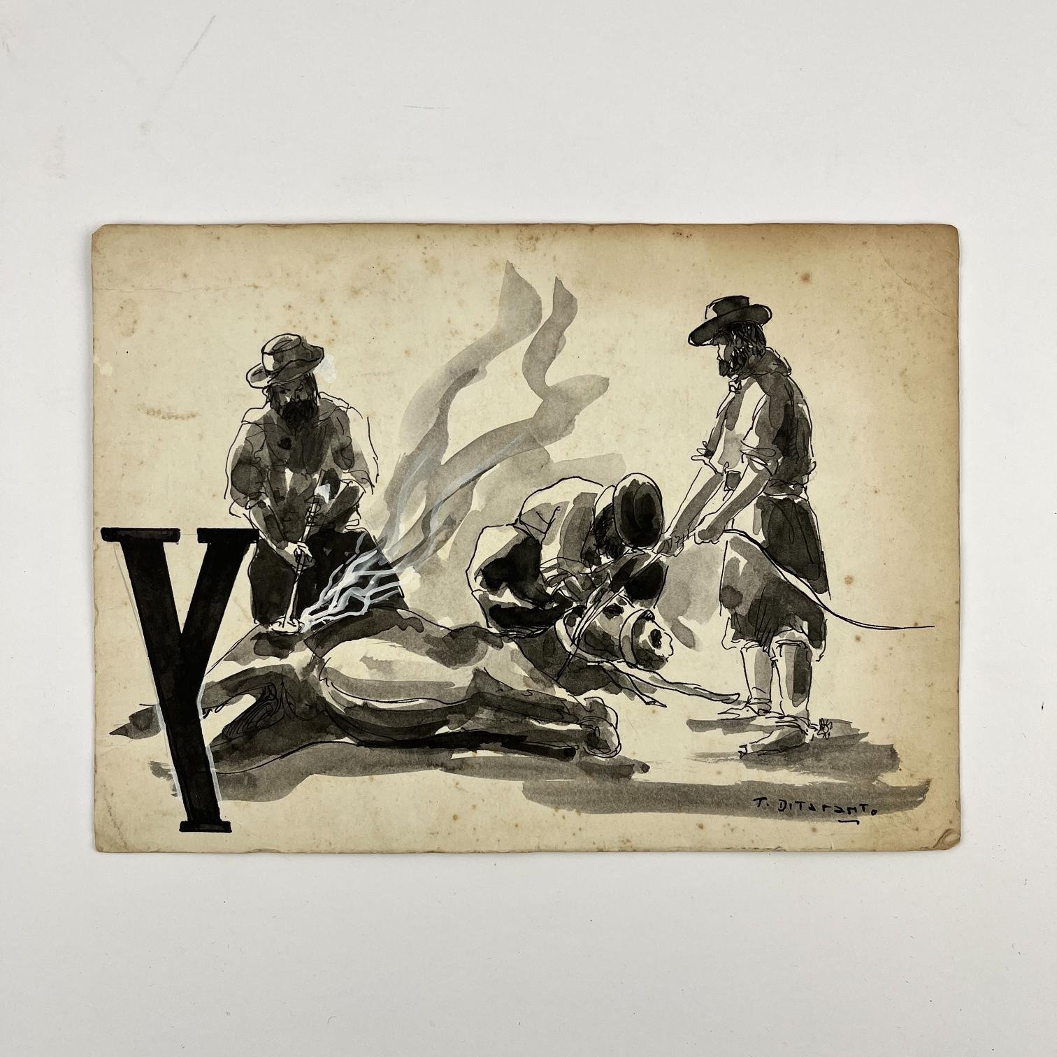 Ilustraciones originales de la obra que escribió Agenor A. Pacheco, “Diccionario Gaucho”. Las imágenes -tinta sobre papel- preparadas por Di Taranto ilustran cada letra del abecedario y fueron utilizadas por el editor de la publicación a modo de letras capitulares. La colección carece de tres letras y cuenta con una segunda versión de la J. Medidas, todas en torno a 14,8 x 11 cm, salvo la Y, que mide 16 x 22 cm. La mayoría de los originales llevan la firma de su autor. Se presentan reunidas en una carpeta de cuero con una escena repujada en su tapa.