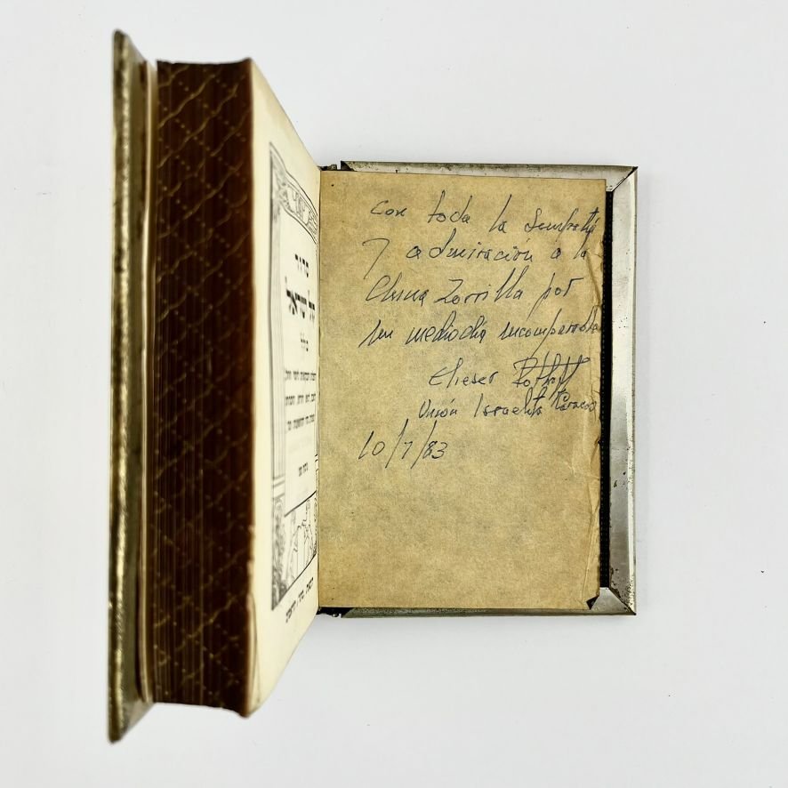 Torá con tapas en metal decorado en relieve, con dedicatoria. «Con toda la simpatía y admiración a la China Zorrilla por su mediodía incomparable.»