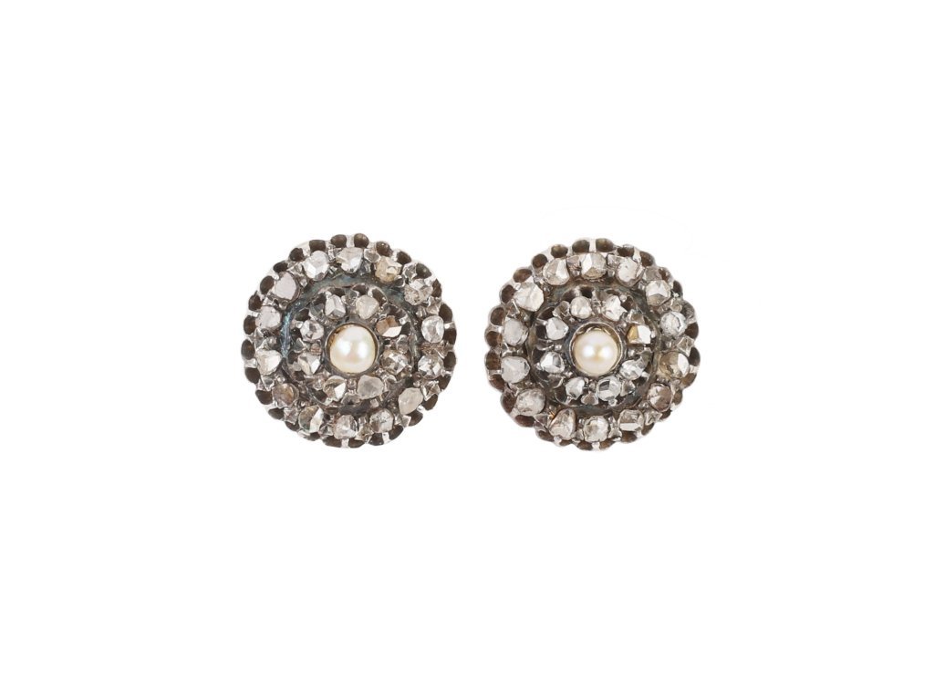 Par de tornillos tipo roseta en oro 18 K amarillo con engarces en plata, perla de cultivo central de un diámetro de 4 mm y veintidós diamantes en cada una, en dos niveles. Diámetro de roseta 18 mm. Peso total bruto 7 gr.