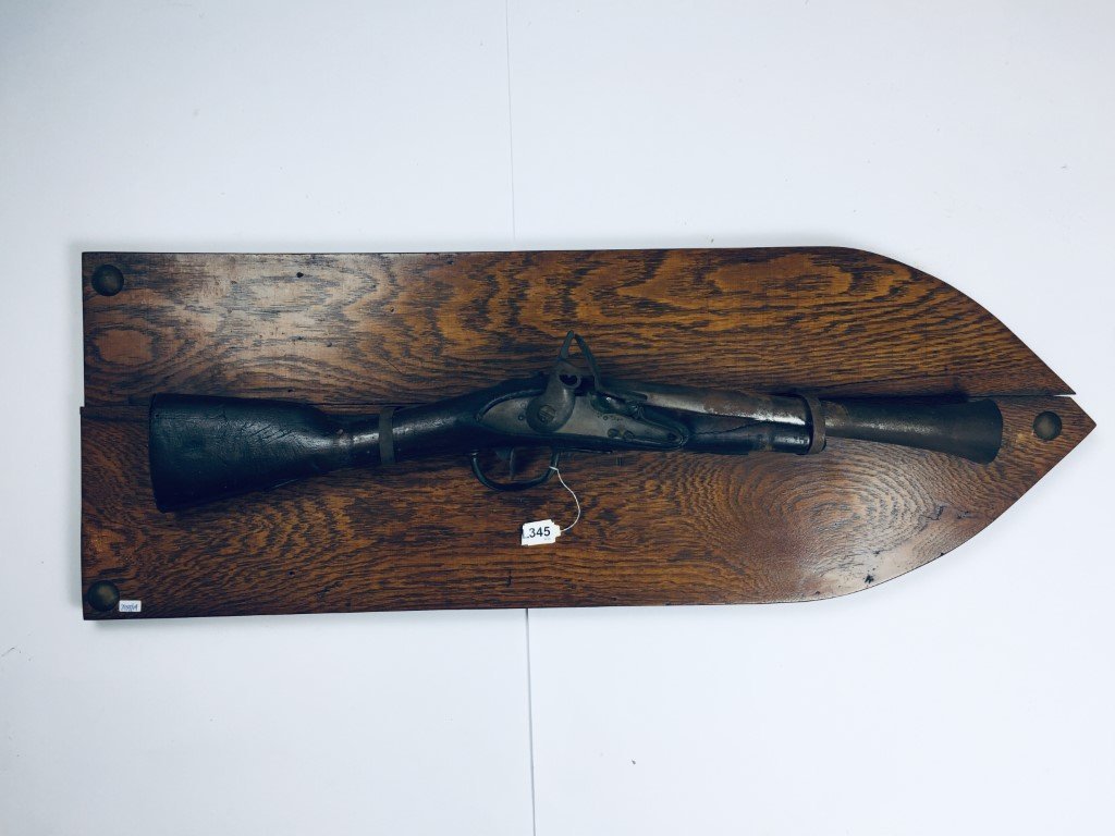 Trabuco naranjero de avancarga sistema a pedernal o de chispa, con caño en hierro. Falta mordaza y baqueta. Averías en madera.