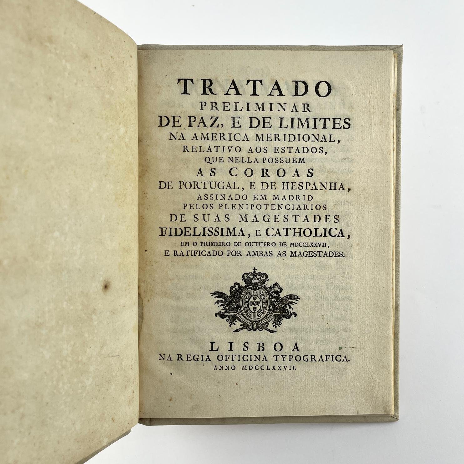 Tratado Preliminar de Paz, e de Limites na America Meridional, relativo a os Estados, que nella possuem As Coroas de Portugal, e de Hespanha, assinado em Madrid pelos plenipotenciarios de Suas Magestades (…) Lisboa. Regia Officina Typografica. 1777.