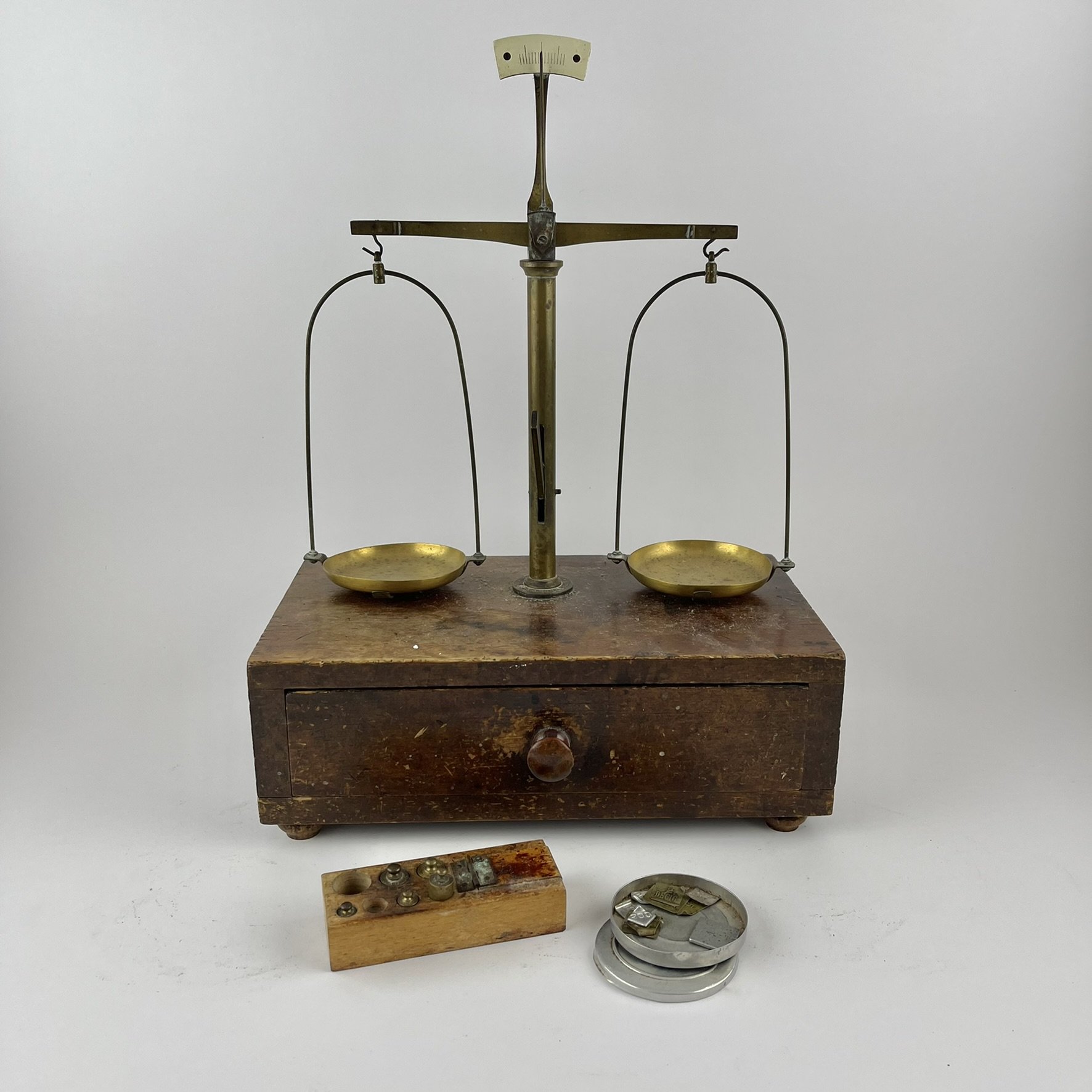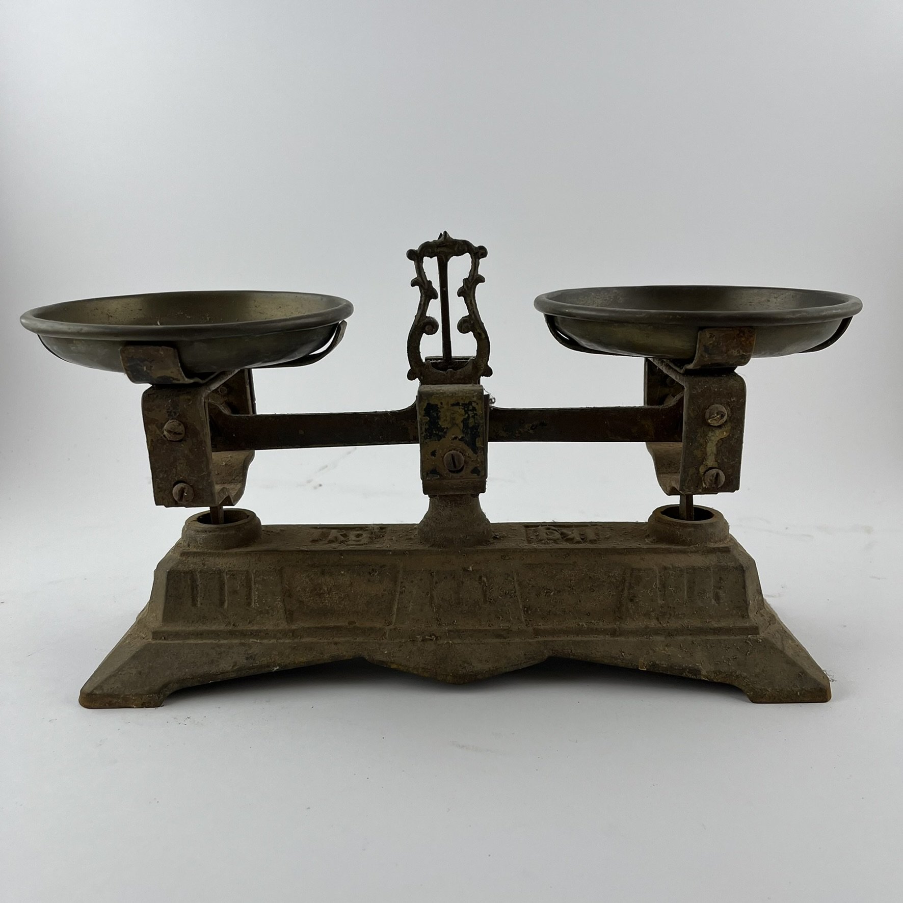 Tres pequeñas balanzas de sobremesa, diferentes, en hierro y madera, con platos en bronce.