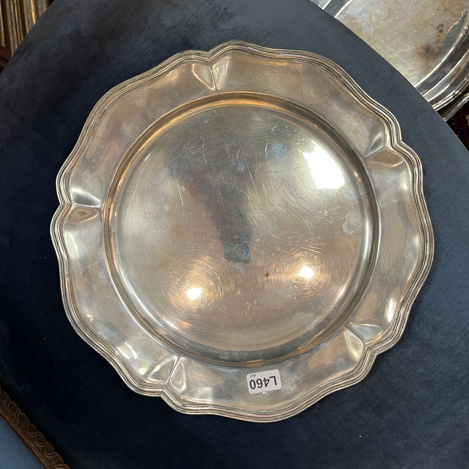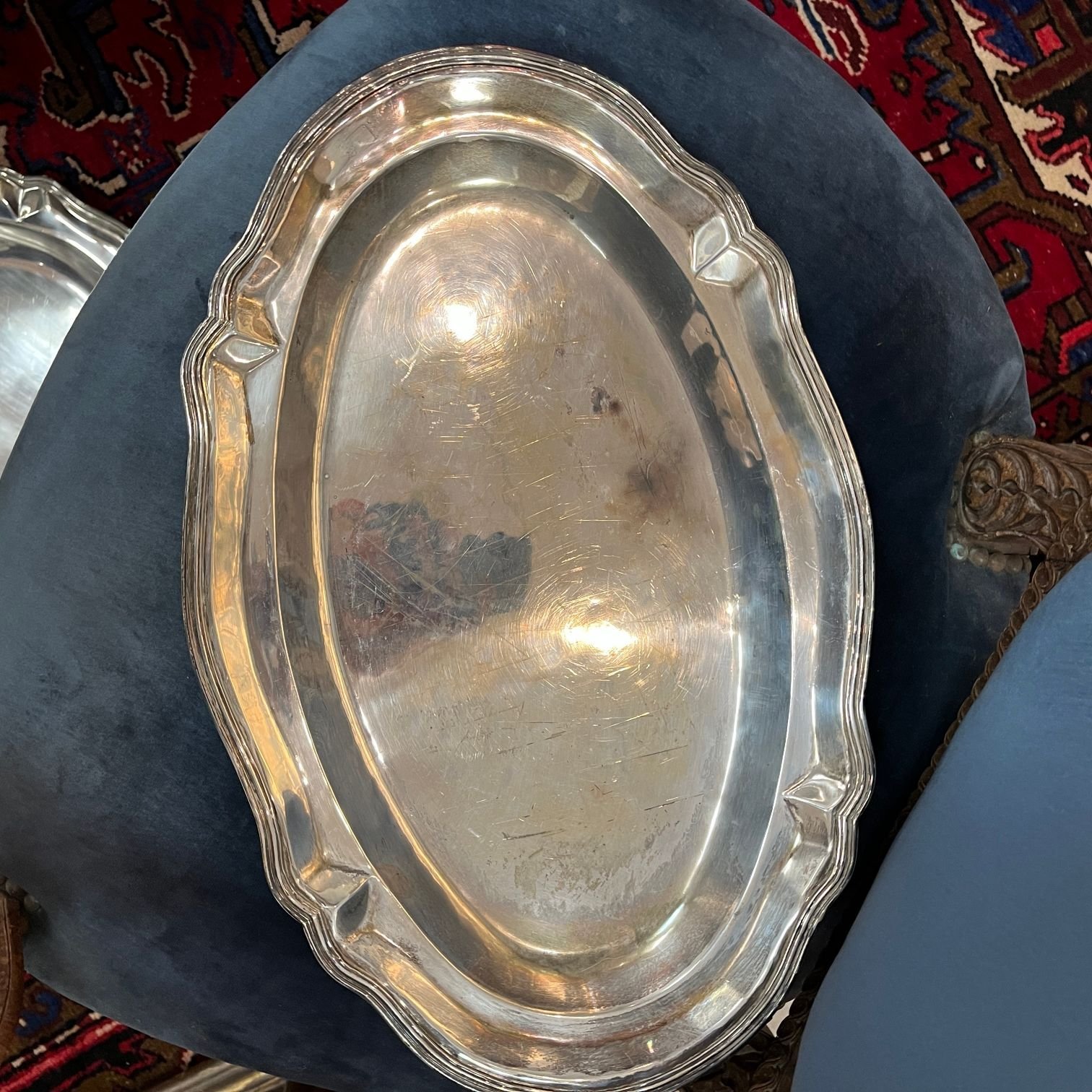 Juego de tres bandejas peruanas redondas en plata Camusso con borde en ondas, dos redondas y una oval. Diámetros 35 y 30 cm. Medidas bandeja oval 46 x 29.5 cm. Peso total 2.500 gr.
