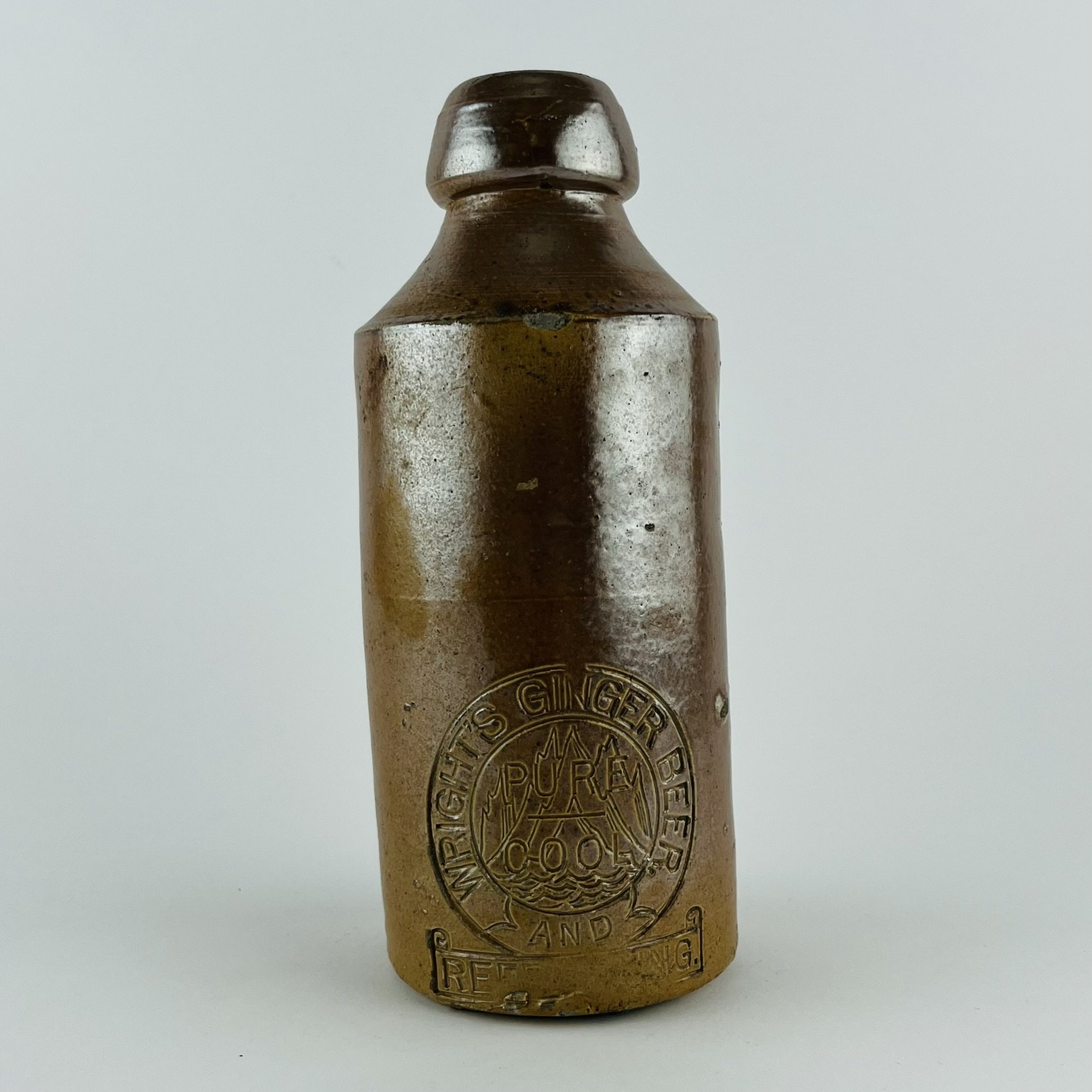 «Wright’s Ginger Beer. Pure Cool and Refreshing.» Marca incisa. Fabricada por Bourne & Denby. Stevenage, Inglaterra.