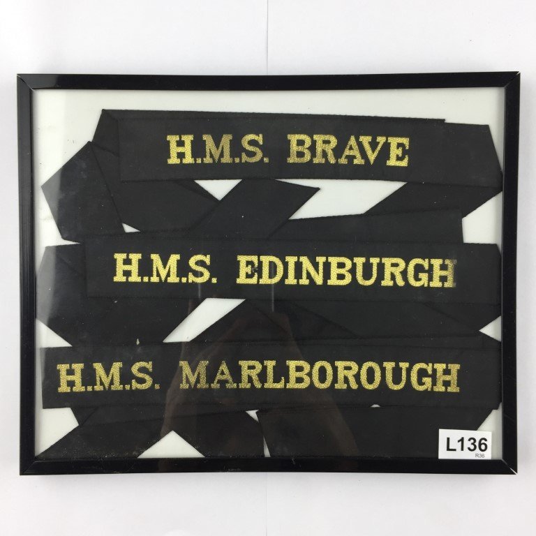 Tres cintas de gorra pertenecientes a los buques británicos Brave, Edinburgh y Marlborough.