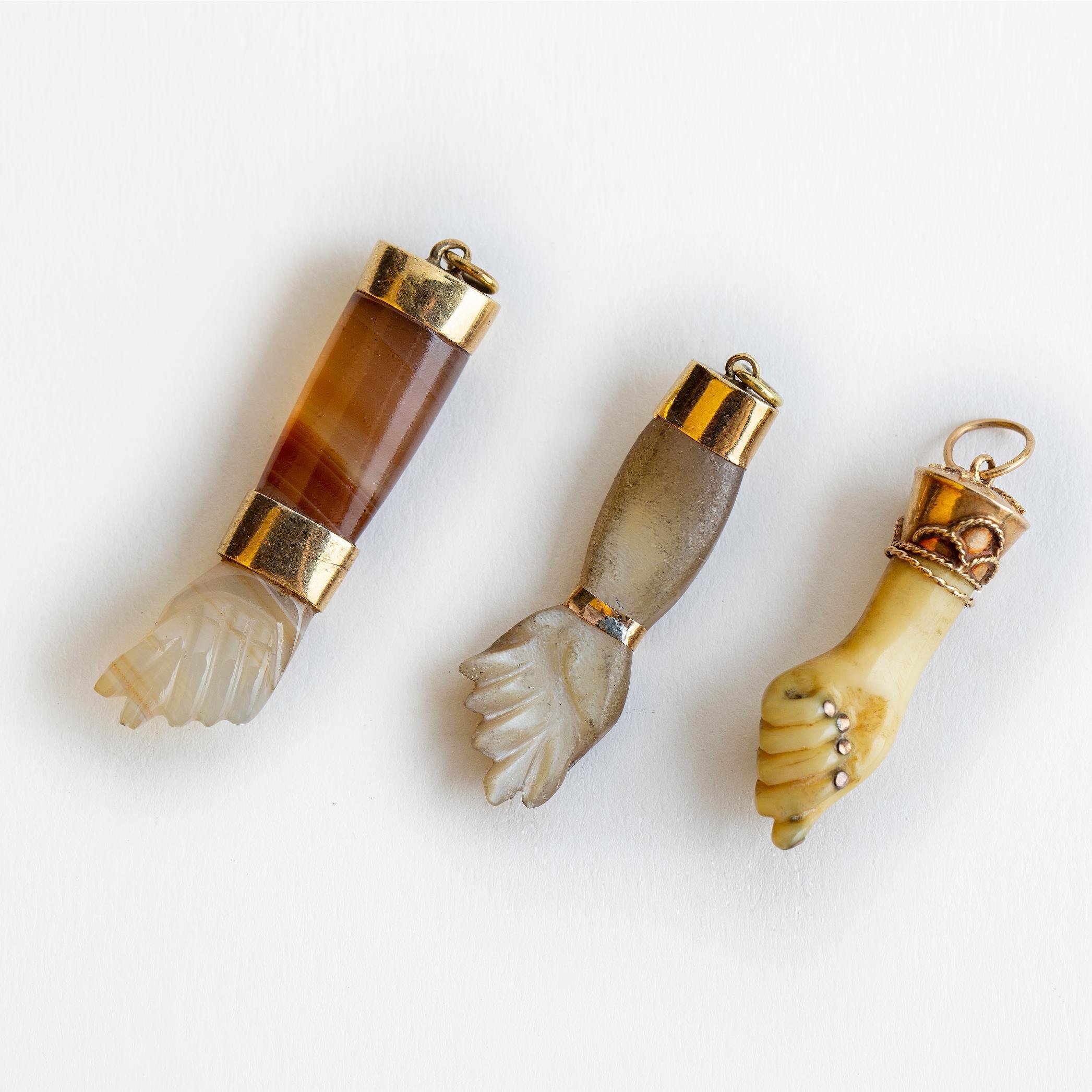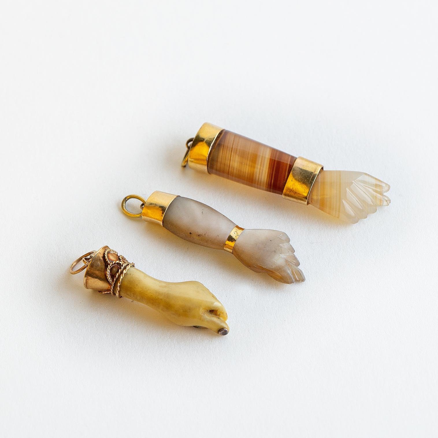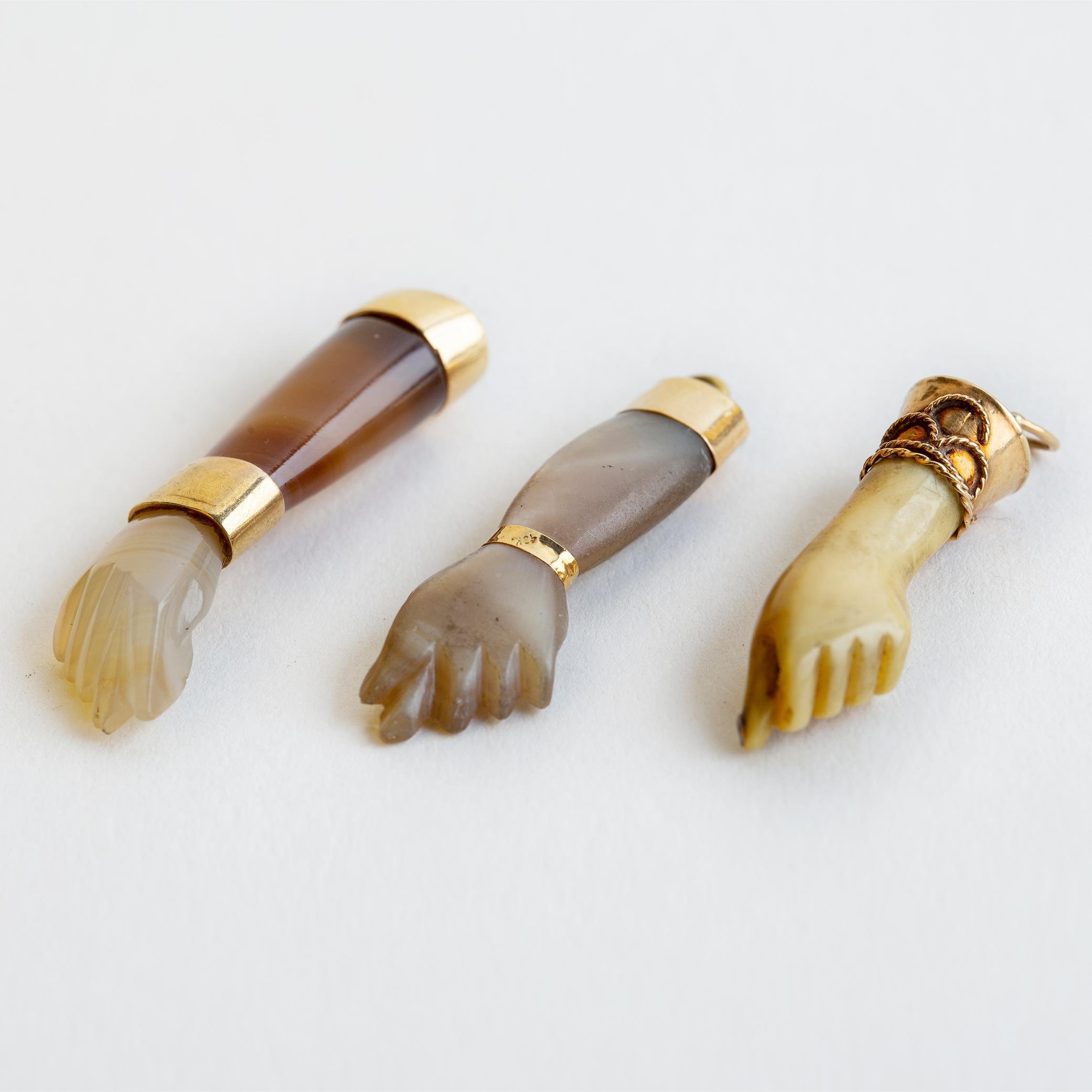 Conjunto de tres dijes con monturas en oro amarillo, esculturados «manos», uno en nácar, otro en ágata y nácar y otro en celuloide.