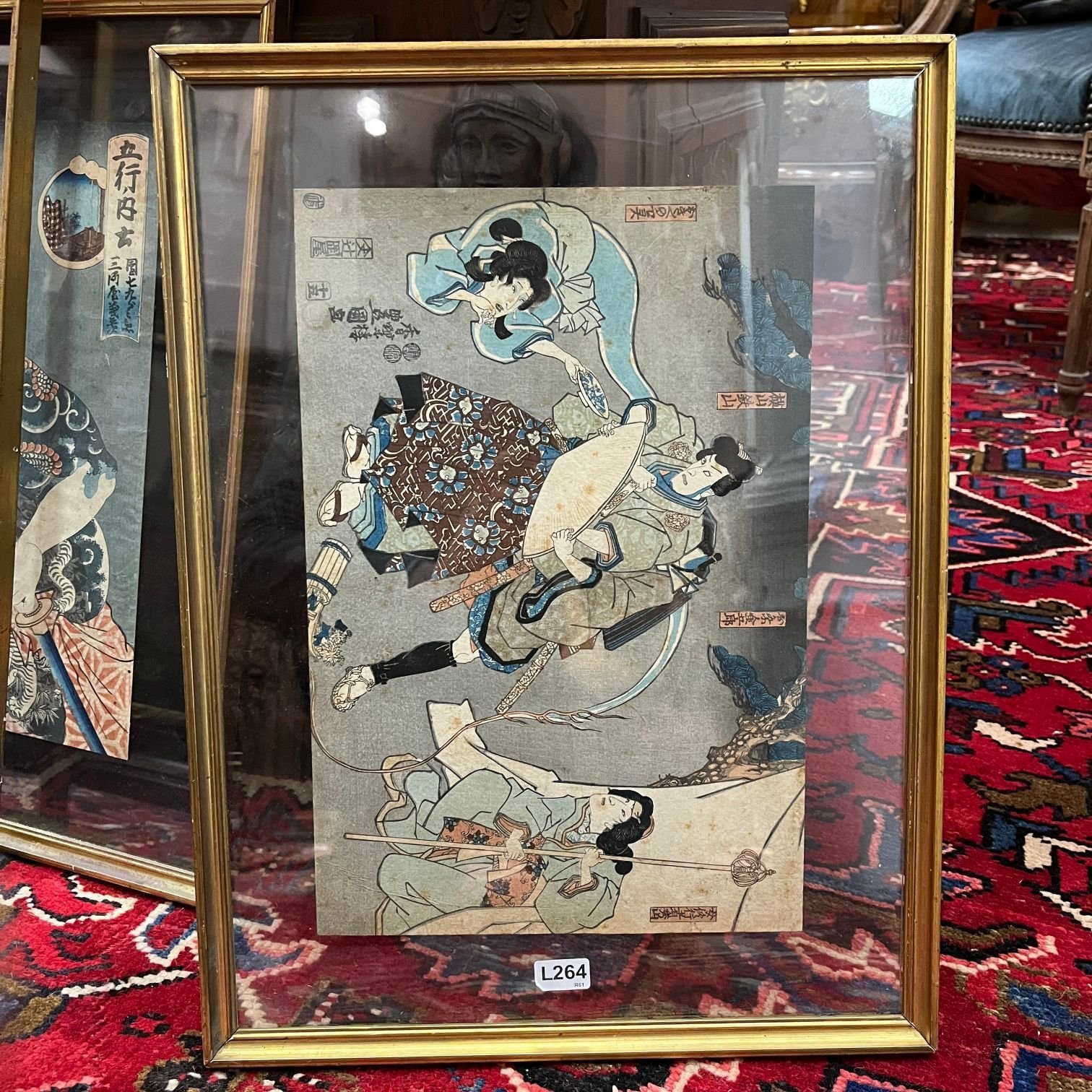 Tres estampas japonesas sobre papel. «Personajes.» 35 x 25 cm, 36 x 22 cm y 23 x 35 cm. Impresas en período Meji. Presentan manchas de humedad.