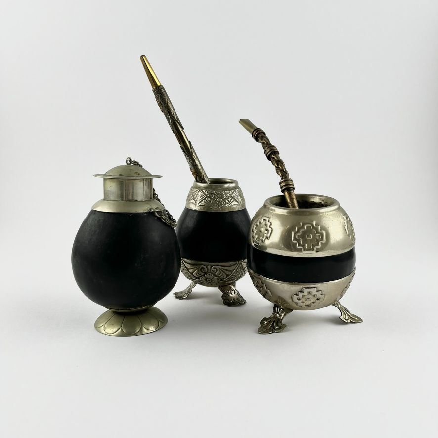Tres mates en calabaza negra y alpaca, dos de ellos con bombillas en alpaca.