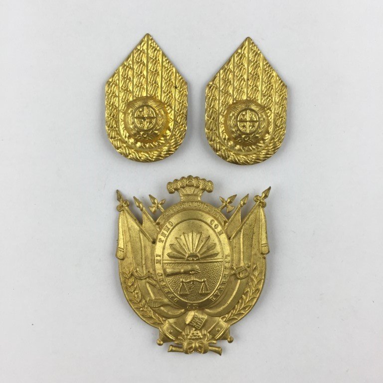 Tres piezas del Cuerpo de Blandengues del ejército uruguayo: insignia de gorra y dos insignias de charretera en metal estampado y dorado.