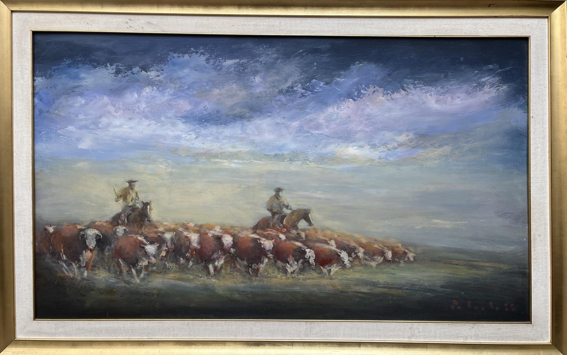 ULDA RUBIOLO (escuela uruguaya, 1932). Óleo sobre fibra. «Arriando ganado.» Firmado abajo a la derecha. 70 x 120 cm.