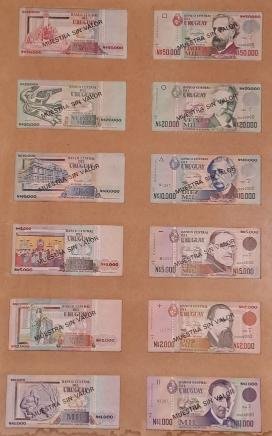 Uruguay 12 billetes. Serie completa de los 6 billetes uruguayos emitidos en 1989 serie A Especimen, de nuevos pesos 1.000 2.000 5.000 10.000 20.000 50.000; encuadrados con vista de ambas caras. Colección Ex presidente del BCU Cr. Ricardo Pascale