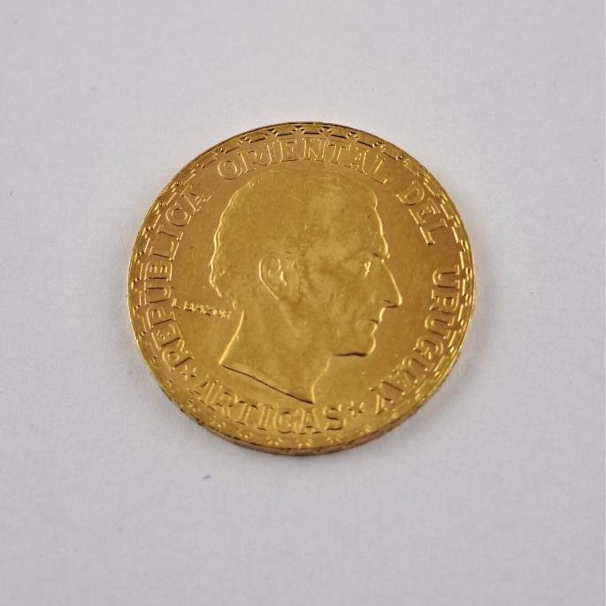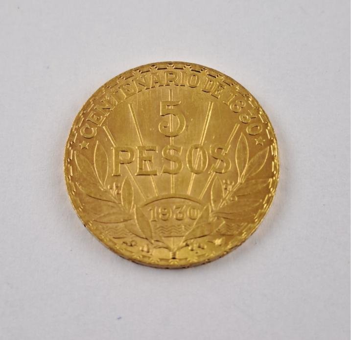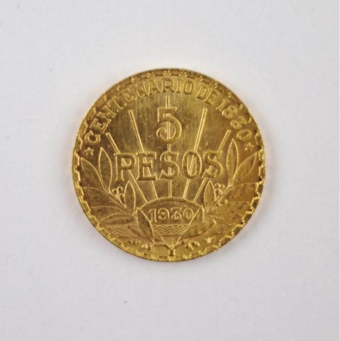 Moneda uruguaya en oro 917 denominación 5 pesos del año 1930. Peso 8,49 gr. Cantidad en circulación: 14415.