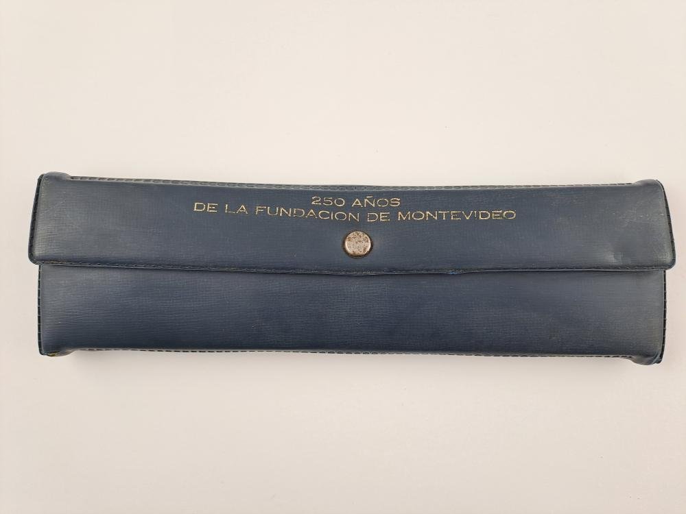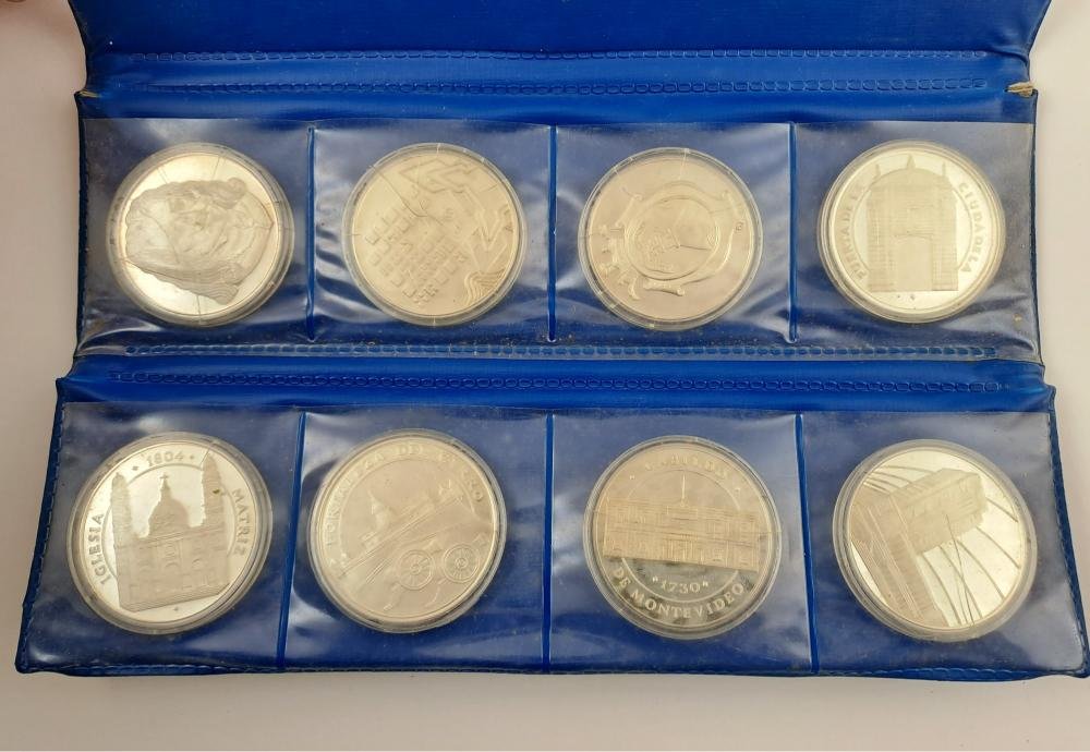 Set uruguayo de ocho medallas en plata 925 conmemorativas del 250 aniversario de la fundación de Montevideo, año 1975, realizadas por Acuñaciones Españolas a pedido de la Intendencia Municipal de Montevideo. En estuche original, encapsuladas. Diámetro 40 mm. Peso de cada una: 25 gr aprox. Fondo espejo.