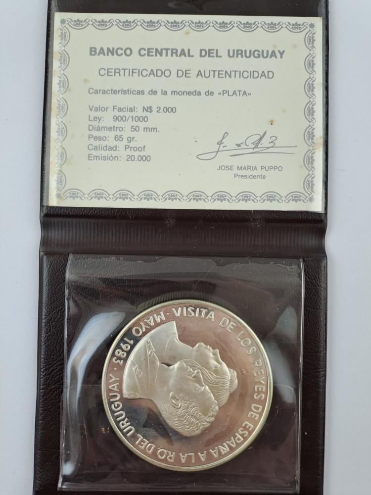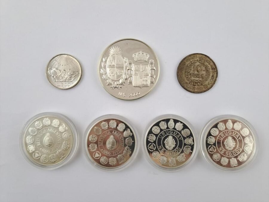 Siete monedas en plata: una uruguaya de 10 pesos del año 1961, una uruguaya de 2.000 pesos del año 1983, dos uruguayas de 50.000 pesos del año 1991, dos argentinas de 1.000 australes del año 1991 y una italiana de 500 liras del año del año 1965.