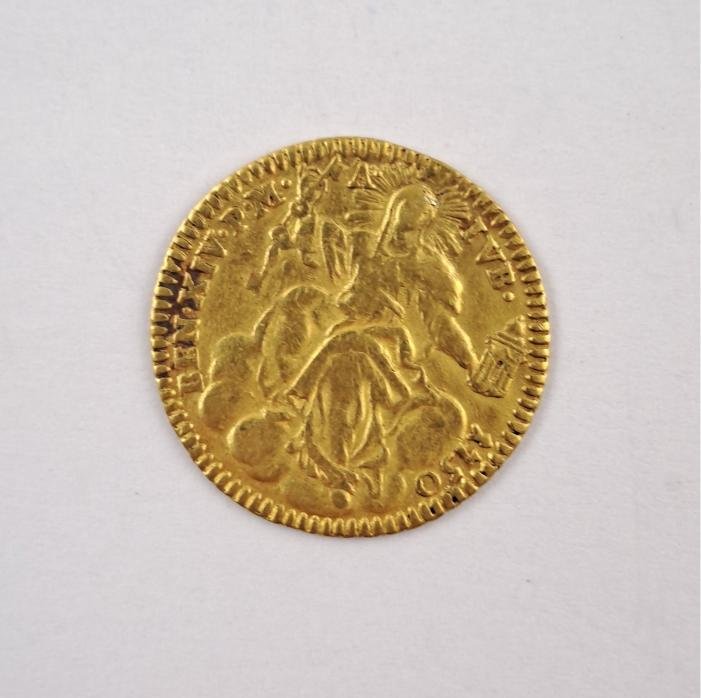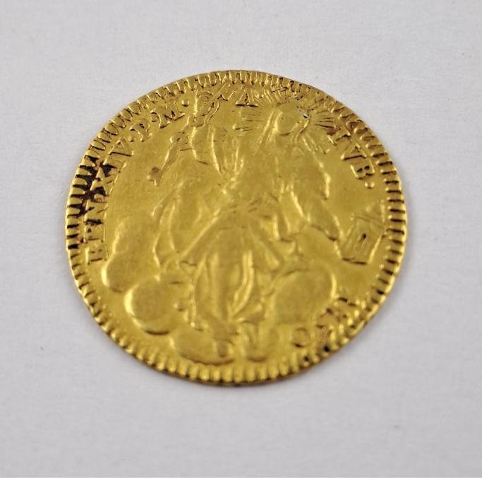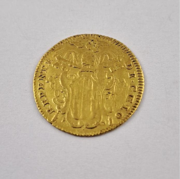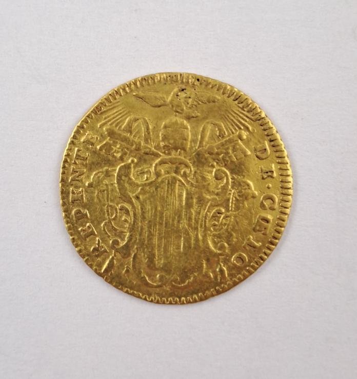 Moneda de los Estados Pontificios, Vaticano, en oro 998 época Benedicto XIV denominación zecchino del año 1750. Peso 3,32 gr.