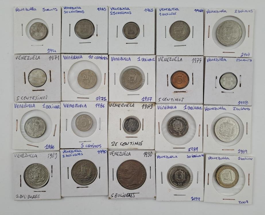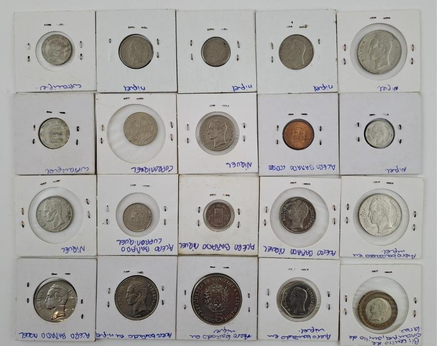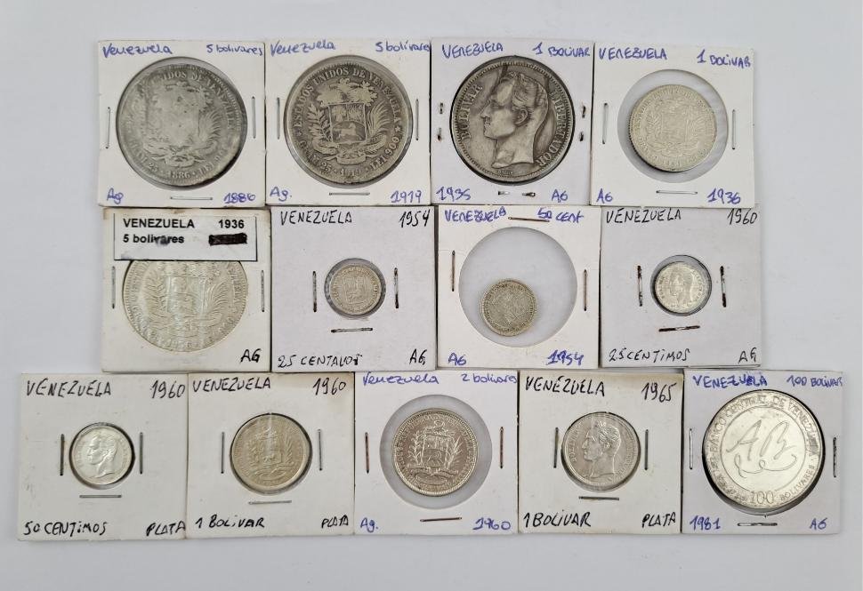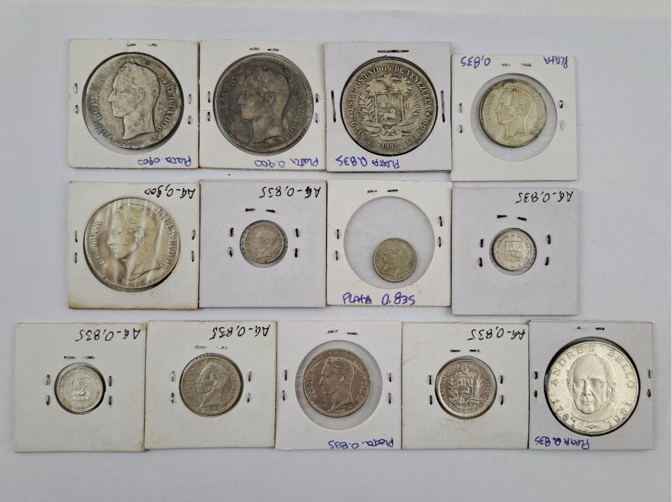 Treinta y tres monedas venezolanas: seis de los Estados Unidos de Venezuela, veintiséis de época republicana, una de la República Bolivariana. Trece de ellas en plata.