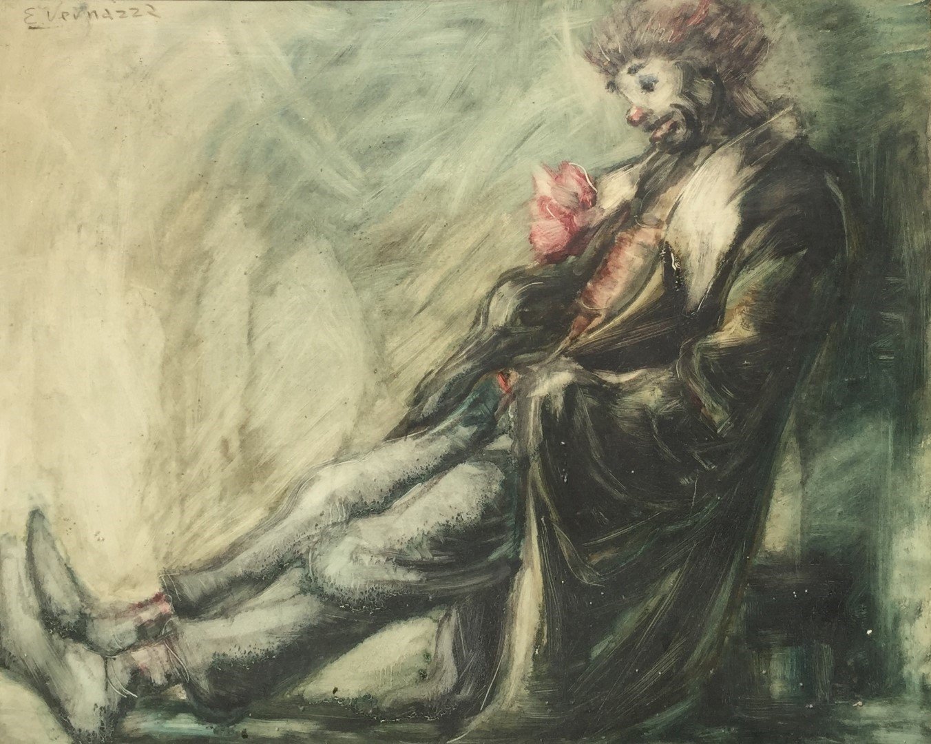 VERNAZZA, Eduardo (escuela uruguaya, 1910-1991). Óleo sobre cartón. «El descanso del payaso.» Firmado arriba a la izquierda. 51 x 61 cm. Al dorso etiqueta de la Galería Moretti.