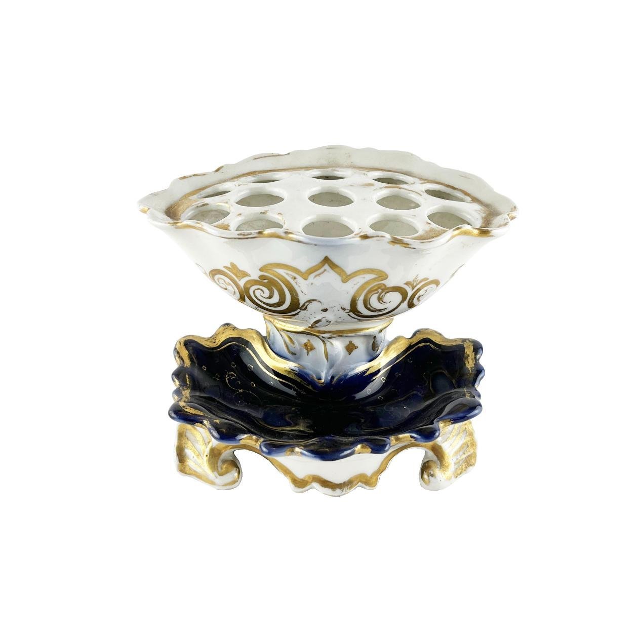 Violetero en porcelana isabelina policromada, con detalles en dorado y antigua etiqueta con inscripción “Familia Ximénez 1865”. Alto 12 cm.