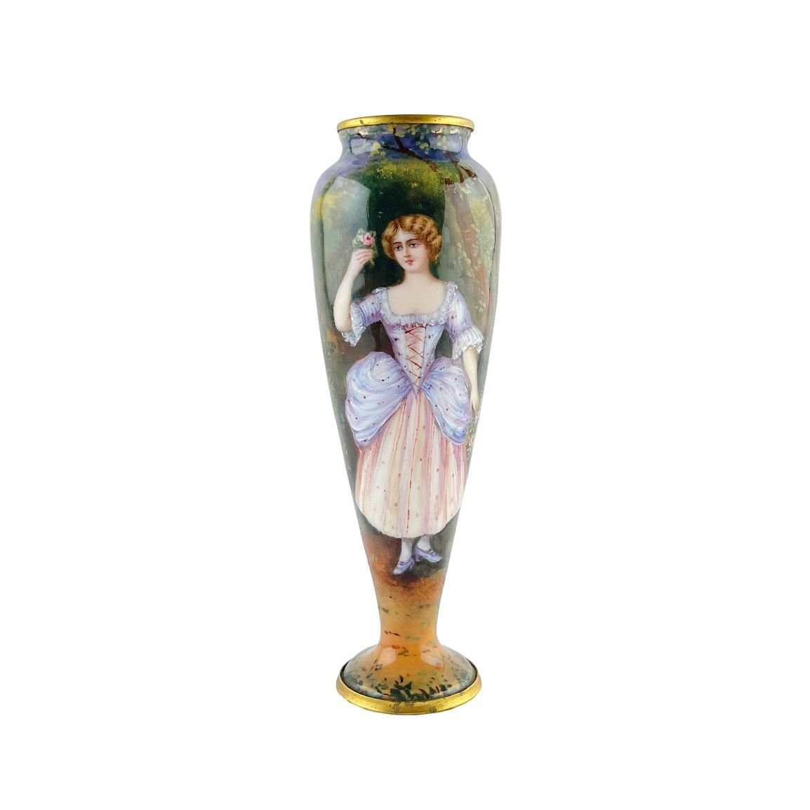 Violetero francés en bronce esmaltado Gamet, pintado a mano «dama y paisaje». 14.5 x 5 cm.