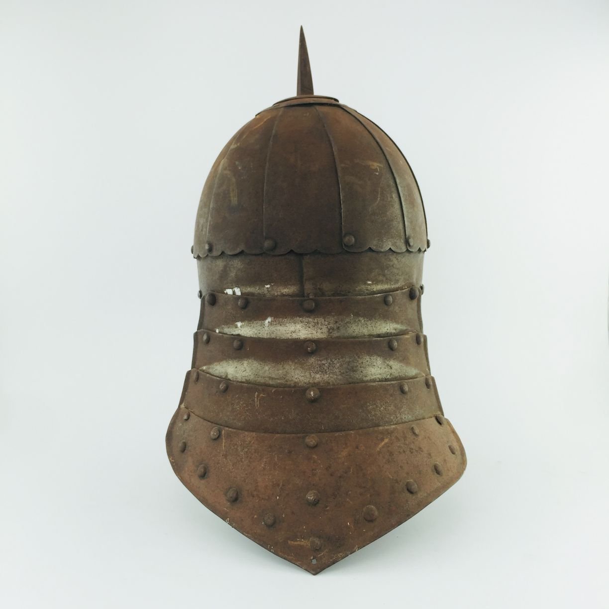 Réplica s. XIX de yelmo, en placas de hierro forjado y remachado. 40 x 32 x 20 cm. Presentado sobre peana en madera.