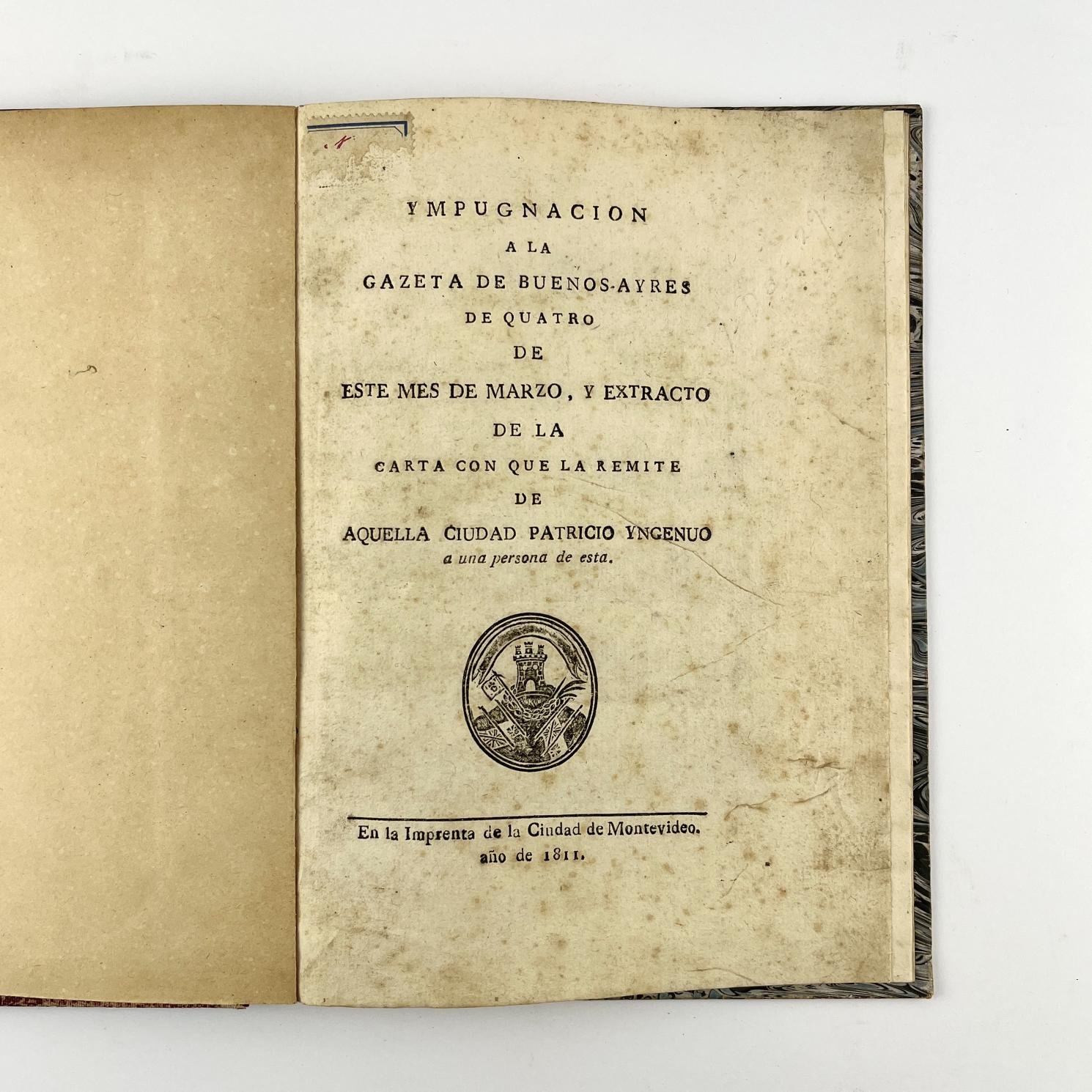 Ympugnacion (sic) a la Gazeta de Buenos-Ayres de quatro (sic) de este mes de marzo, y extracto de la carta con que la remite de aquella ciudad Patricio Yngenuo (sic) a una persona de ésta. En la Imprenta de la Ciudad de Montevideo. Año de 1811. Muy temprano y raro impreso uruguayo. En 4° (21 x 15 cm), 23 pp., incluye Portada. Encuadernación con lomo de tela y títulos dorados. En buen estado, con hojas tostadas. No en Estrada. Arredondo, p. 48, colaciona un ejemplar de la biblioteca de Gustavo Gallinal.