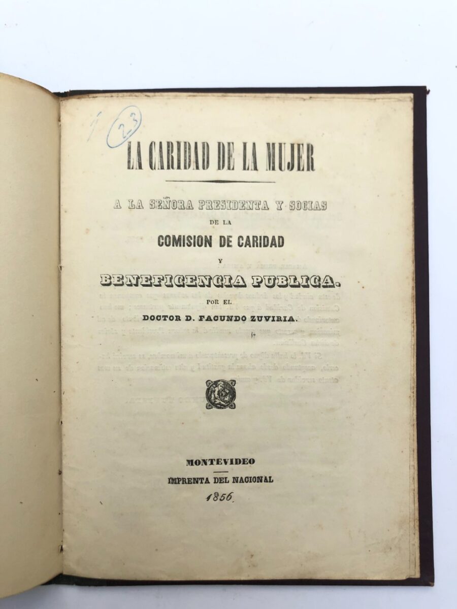 ZUVIRÍA, Facundo: La caridad de la mujer a la señora presidenta y socias de la comisión de caridad y beneficencia pública. Montevideo, Imprenta del Nacional. 1856. Encuadernación en pleno cuero.